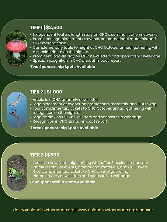 If you are interested in having a conversation about how your Business can contribute to CHC, please send an email to our Executive Director, Dave Erickson. dave@coldhollowtocanada.org